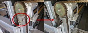 見た目では異常が分かりにくいことも多いため放置しがちですが、チェーンの脱落や偏摩耗、最悪の場合は機械の故障や車輌事故にもつながりかねません。