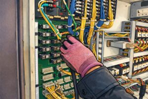 機械式駐車場の操作盤は、単体で動いているわけではなく、制御盤内の機器とケーブルでつながりながら動作しています。