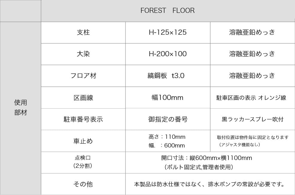ライン・駐車番号のリペイント、不可抗力による床板の破損など。補修用塗料はローバル塗料、錆が進行した場合は床材の部分交換をお勧めします。